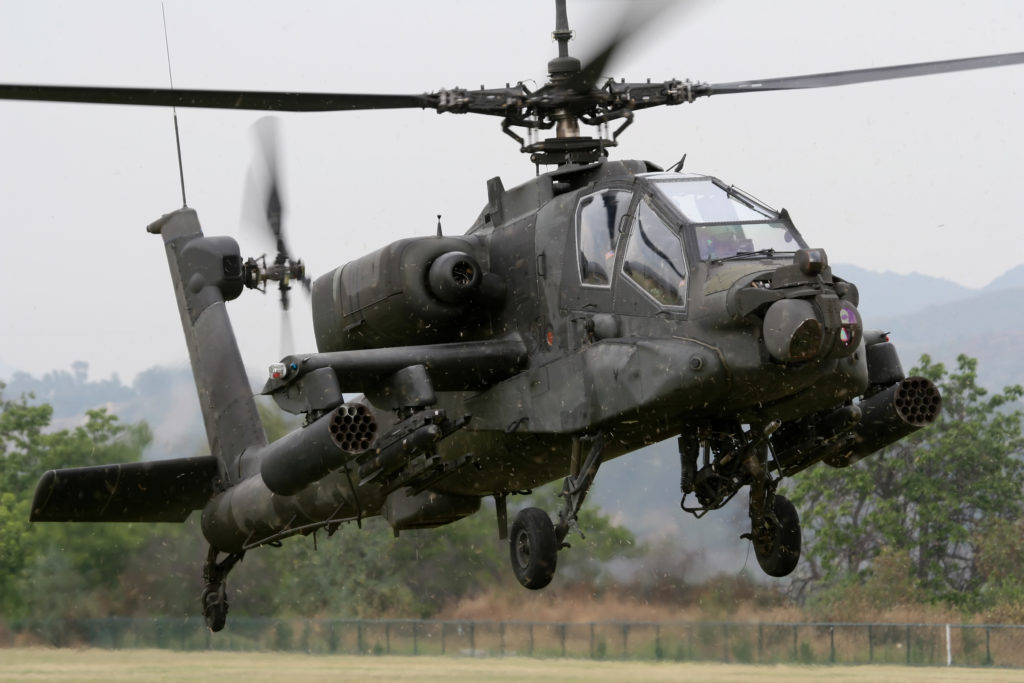 Previous Image Next Image Aerial view of attack helicopter in flight An AH-64 military attack helicopter departing from a grass field. AH-64 military attack helicopter, Tunable Filter