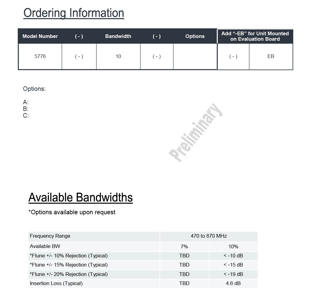The 470-870Mhz filter is a single band tunable filter offering the advantage of small size with a control system comparable to larger size filters.The 5776-10 filter has 2 watt power handling capability.